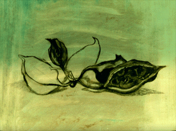| Houtskool tekening op geschilderd papier | Exotische zaaddoos | ||
